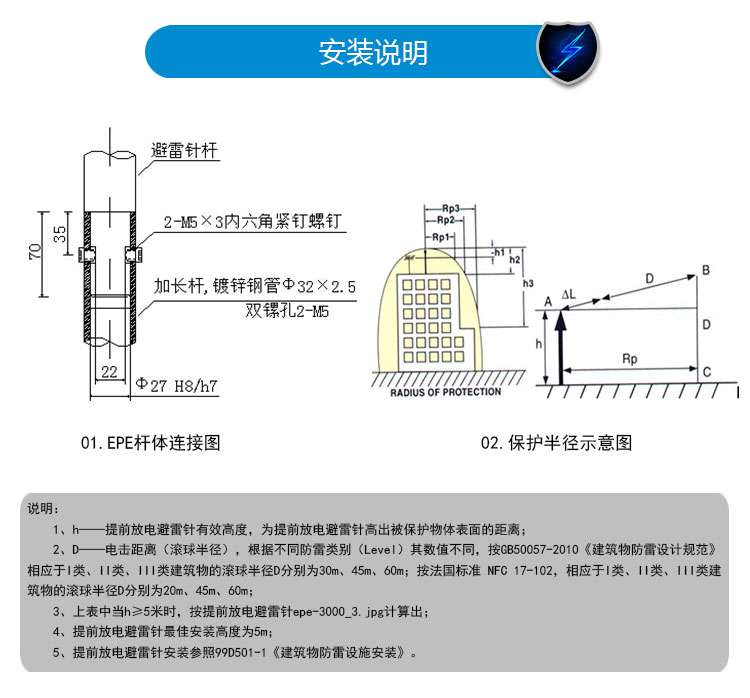 EPE系列提前放電避雷針(以下簡稱EPE避雷針)采用法國技術(shù),符合法國NFC17-102標(biāo)準(zhǔn)。它由三種系統(tǒng)(大氣電力電容器、高壓脈沖發(fā)送系統(tǒng)、電流泄放系統(tǒng))組成,具有雙重瞬間放電裝置,被多層的具有隔絕惡劣環(huán)境及水密性的材料所保護(hù);無老化危險(xiǎn),免維護(hù)。在相同的安裝高度下,比普通瞬間避雷針的保護(hù)半徑大數(shù)倍,搶先放電時(shí)間為30μs~60μs,即優(yōu)先引雷入地。